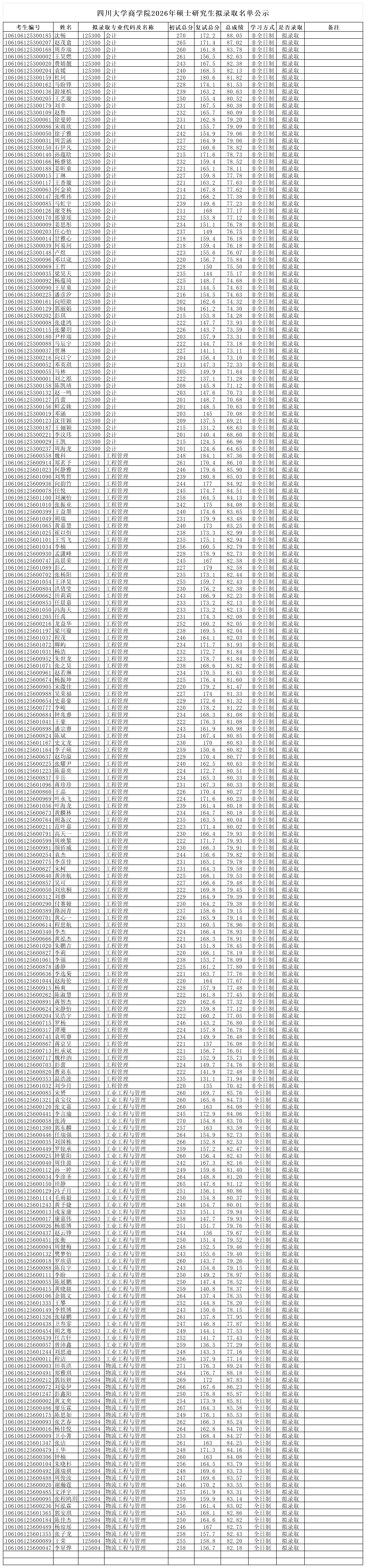 四川大学商学院学院2026年专业硕士研究生(不含工商管理)拟录取名单公示