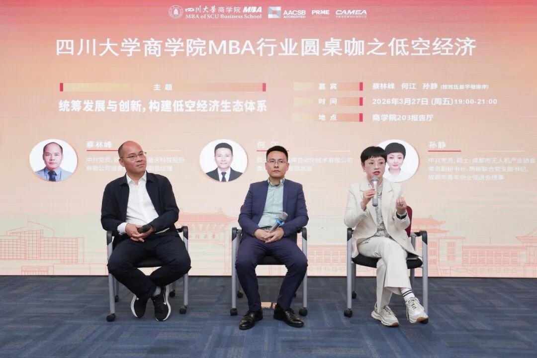 3月27日晚,四川大学商学院MBA行业圆桌咖在商学院203报告厅成功举办。本次行业圆桌以“统筹发展与创新,构建低空经济生态体系”为主题,邀请到中电科普天科技股份有限公司运营商事业部副总经理蔡林峰先生、成都纵横自动化技术有限公司集成解决方案部总监何江先生和成都市无人机产业协会常务副秘书长孙静女士担任活动嘉宾。本次活动由四川大学商学院MBA教育中心和MEM教育中心联合举办,MEM教育中心主任梁学栋担任主持,100余名学生共同参与了本次活动。